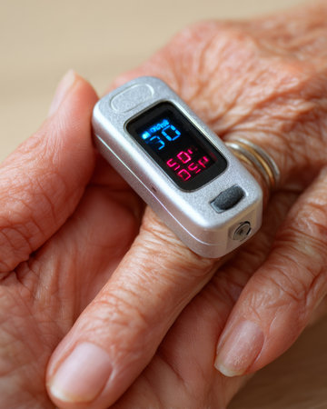 Close-up of a nurse using a pulse oximeter on an elderly patient's finger, measuring blood oxygen levels