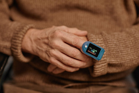 Senior Caucasian man sitting in nursing home holding pulse oximeter on finger monitoring blood oxygen level, close up hands visible focusing on healthcare and elderly care concept