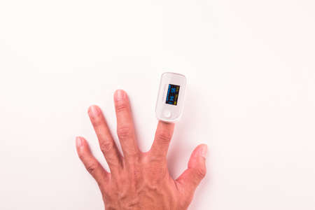 Plus Oximeter on fingerstips on white background, digital device to measure oxygen saturation in blood, Device on Caucasian male hand, The concept of medicine, healthcare.