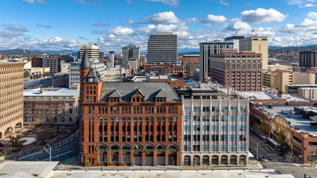 Historic buildings at the forefront in the downtown urban area of Spokane Washington