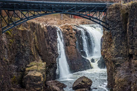 The Great Falls of Paterson framed by the steel arch bridge high above.