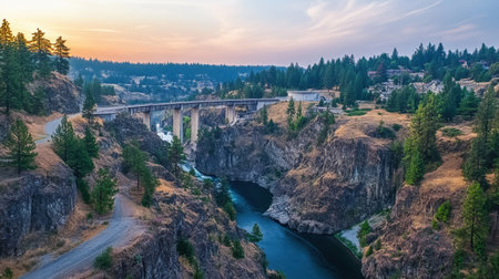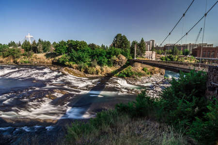 Huntington Park and Monroe Street Bridge at Lower Spokane Falls in downtown Spokane, Washington on bright clear sunny summer morning..