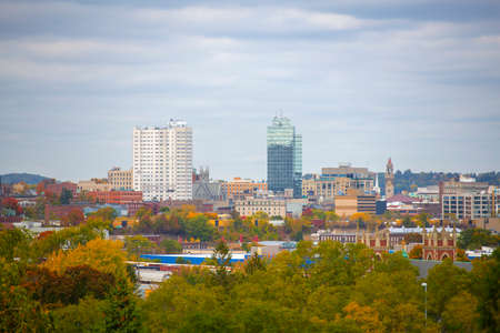 Aerial view of downtown Worcester including the 600 Main Street building and Worcester Plaza with fall foliage in city of Worcester, Massachusetts MA, USA.