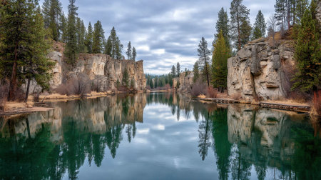 This stunning image captures a tranquil river surrounded by majestic cliffs and lush trees, reflecting the beautiful sky and landscape.
