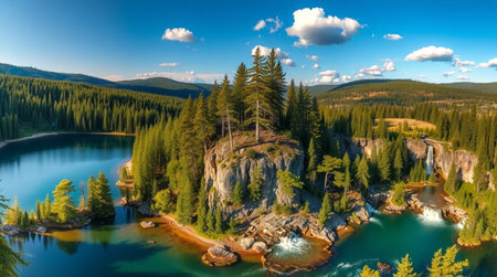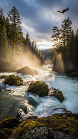 An eagle soars gracefully in a sunlit sky above a powerful, rushing river flowing through a moss-covered rocky canyon. Sunbeams cut through the mist, illuminating the vibrant green trees and the...