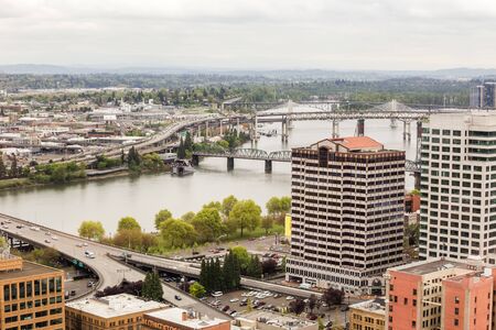 View from highrise building of downtown Portland and the Willamette River in Portland, Oregon, USA.