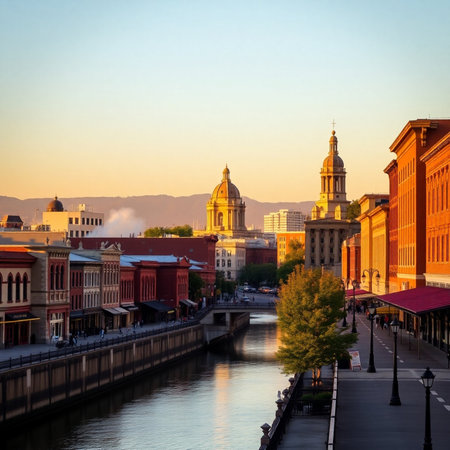 An aerial perspective reveals a sprawling modern city skyline at sunset, with a river winding through its urban core. Tall skyscrapers and various buildings are illuminated by the warm, golden light of the setting sun, casting long shadows. In the distance, rolling, arid mountains form a natural backdrop to the man-made landscape. The sky is dotted with soft clouds, and the overall scene a vibrant metropolitan area bathed in the soft glow of twilight.