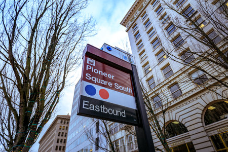 Portland, Oregon, United States - Dec 19, 2017: TriMet train stop sign of Pioneer Square South