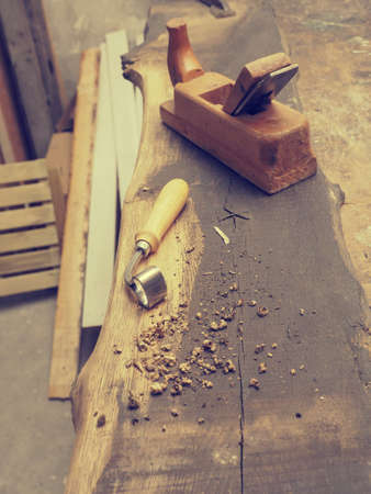 Antique woodworking hand tools on sawdust covered rustic workbench in carpentry workshop