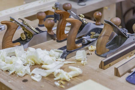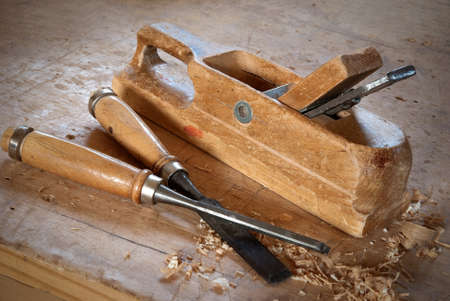 Woodworking carpenter's wood shaving plane and tools