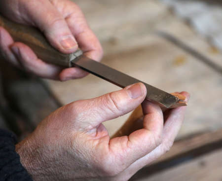 hands of an elderly carpenter while the piece of wood with a sharp chisel