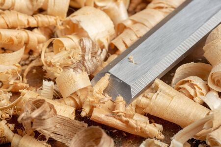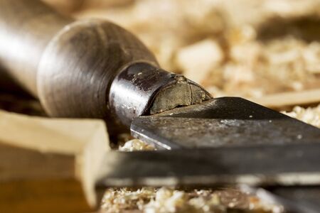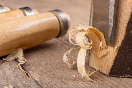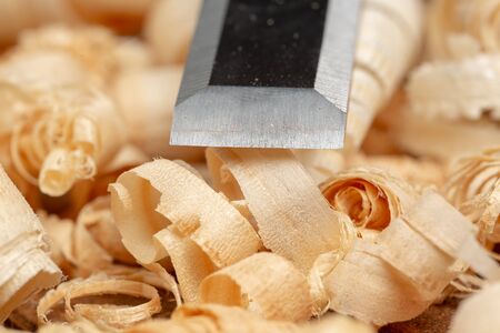 Chisel with wood shavings. Carpenter cabinet maker hand tools on the workbench.