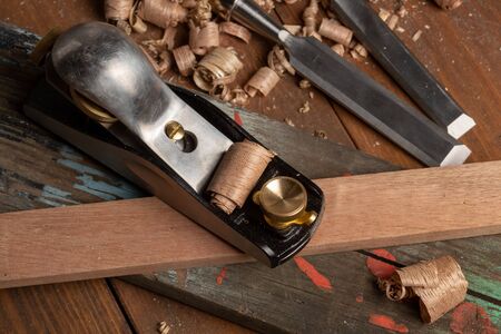 Chisel and small block plane with wood shavings. Carpenter cabinet maker hand tools on the workbench.