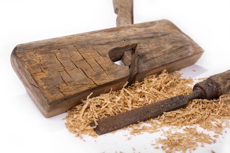 Vintage rusty plane and chisel on a white