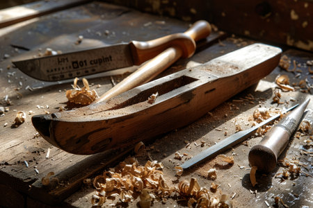 A rustic collection of vintage woodworking tools rests on shavings in a well-used workshop. This image showcases craftsmanship and the beauty of handmade artistry.
