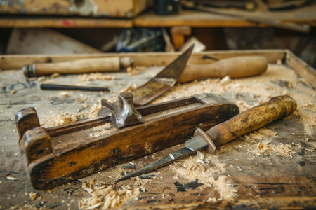 Vintage woodworking tools on sawdust covered table in a rustic carpentry workshop