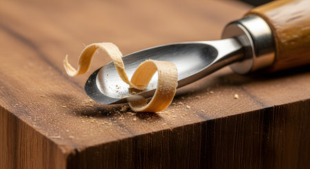 A macro, close-up shot of a sharp woodworking gouge (a type of chisel) resting on a block of dark walnut wood. A delicate, curled wood shaving lies on the tool's blade, indicating the process of carving. The image represents craftsmanship, carpentry, woodworking, and the beauty of handmade creations.