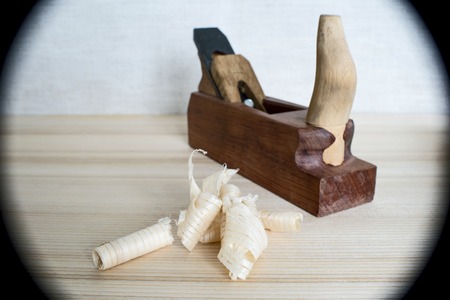 Hand-made wooden plane and wooden shavings on the table close-up. The concept of DIY. Joiner hand tools for woodworking and crafts.