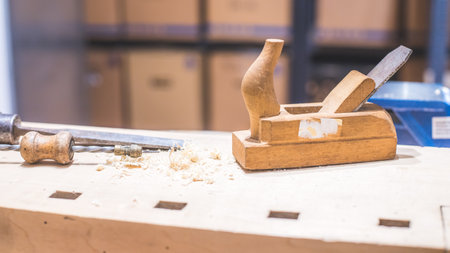 Close up of plane for smoothing timber, workshop