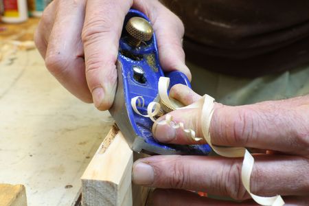 Close-up of carpenter s hands and plane tool.