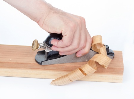 Hand moving wood planer over redwood plank isolated on white background.