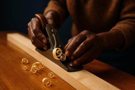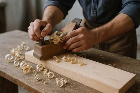 Skilled hands using a hand planer to smooth wooden boards, creating precise wood shavings on a carpentry workbench.