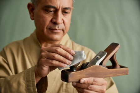 Skilled middle aged man carefully maintaining a traditional wooden hand planer for carpentry against a plain green background.