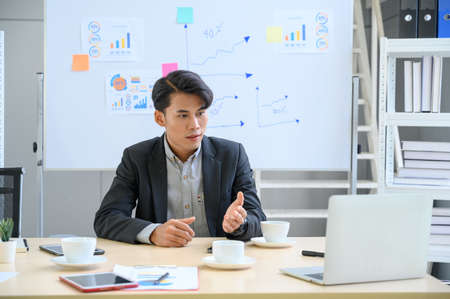 Young Asian businessman making FaceTime video calls, teleconference, having discussion and working on laptop computer sitting at the office, waving hand to webcam. Distant Communication Concept.
