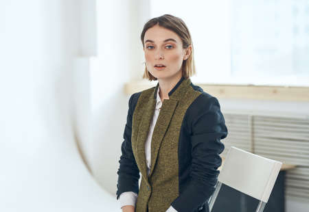 Woman in a jacket on a light background near the window model cropped view