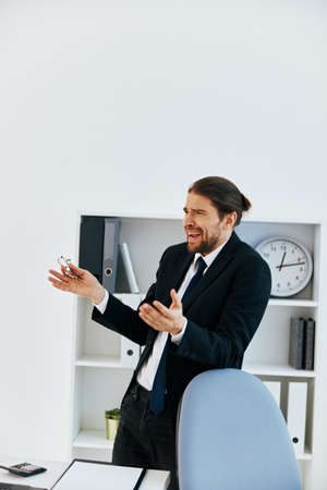 Businessman demonstrates gesture with his hands to camera