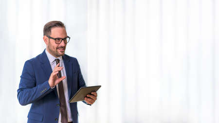 Professional man in plaid blazer speaks with tablet during outdoor business discussion