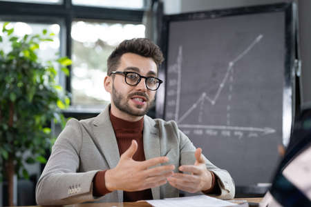 Confident teacher in eyeglasses and formalwear explaining his students important points of subject