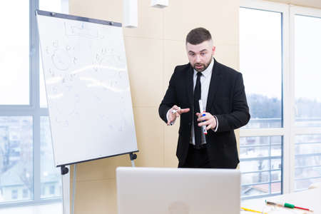 business presentation man in formal suit holds meeting online using laptop webcam.during video conference make a strategy, meeting, briefing. show on whiteboard in a modern office call remotely