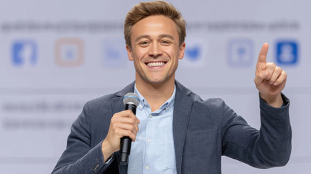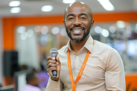 Smiling Motivational Male Speaker With Microphone, Delivering Inspiring Talk in Office Setting