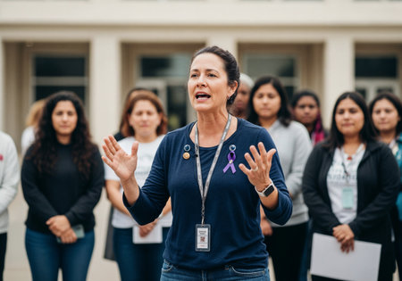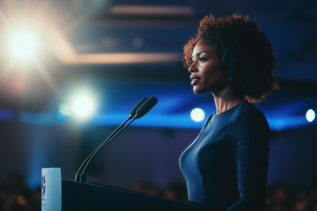 A woman standing confidently at a podium, advocating for gender equality and women's rights
