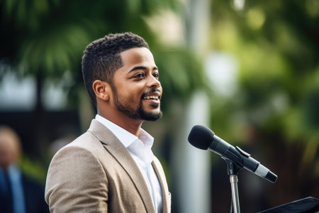 shot of a handsome young man giving a speech at an event, created with generative ai