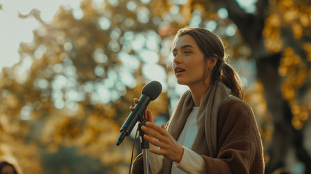 Confident Woman Speaking into a Microphone at a Public Event. High quality photo