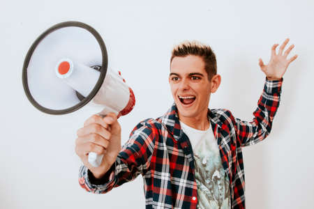 isolated young man shouting with megaphone