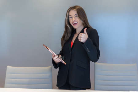 Portrait of a business woman holding a microphone and looks ahead