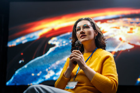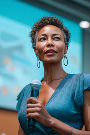 Eye-level close-up of a poised woman with a microphone during a conference presentation, radiating confidence while addressing a focused audience in a professional setting.