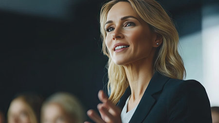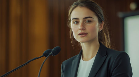 A woman in a suit is giving a speech. Generative AI.