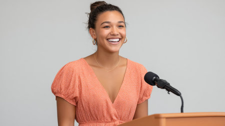 A cheerful young woman delivers a speech at a podium, showcasing confidence and joy. Her stylish orange dress adds flair to the positive atmosphere of the event.