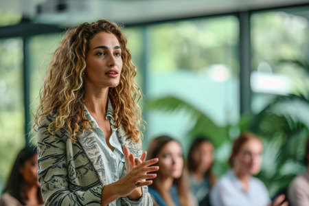 Female manager giving presentation to a group of professionals, embodying empowerment and career success.