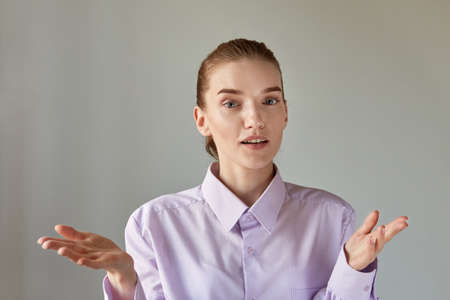 A young woman looks at the camera and says. Online conference. Beautiful female face with natural makeup.
