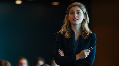 A confident businesswoman stands with arms crossed in a modern office, ready to deliver a compelling presentation to an engaged audience.