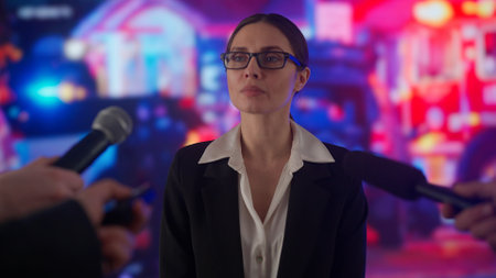Female expert answering questions.. People journalists news reporters taking interview with woman outdoors, reporting on air, police and ambulance cars at the back.