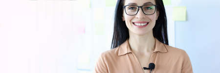 Portrait of smiling woman in glasses with microphone on blouse