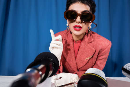 woman in vintage sunglasses and white gloves pointing with finger during interview on blue background