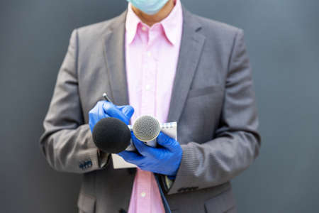 Journalist at news conference wearing protective gloves and face mask against coronavirus COVID-19