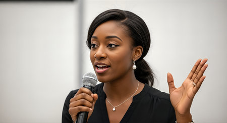 African American woman is speaking into a microphone, using hand gestures to emphasize points, radiating confidence and engagement in a professional environment